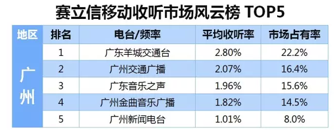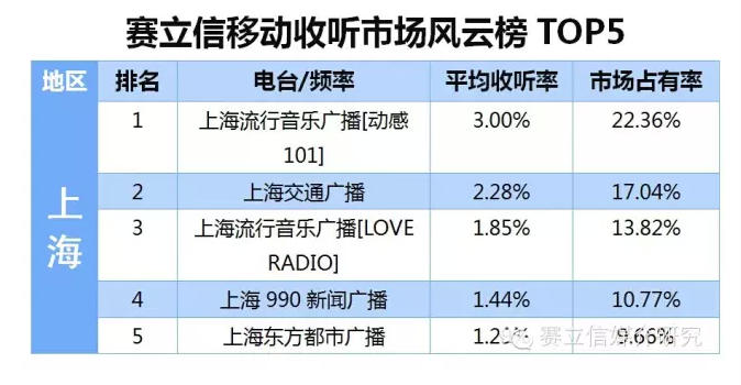 2015年5月份赛立信移动收听风云榜 五城市 TOP5 发布:上海、广州、深圳、福建、南京广播电台收听数据,深圳广播电台交通频率以3.19%平均收听率占据首位。
