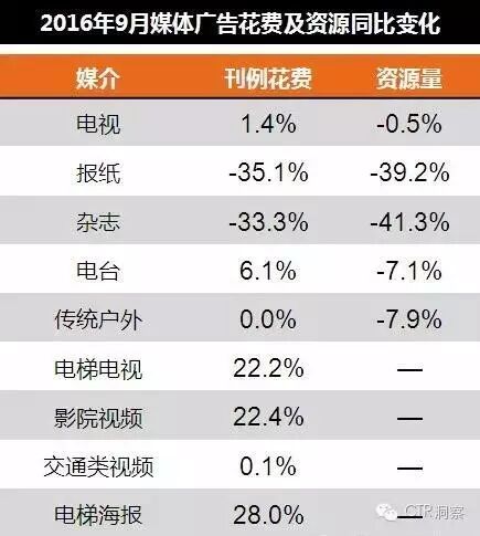央视市场研究(CTR)zui新研究显示,2016年9月广告市场(不含互联网)同比增长1.3%。其中,传统媒体同比下降1.6%,与上月相比降幅有所收窄。