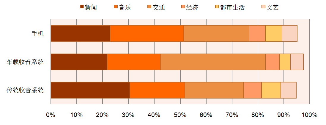 图1 2015年不同区域各类频率的市场份额 数据来源:赛立信媒介研究, 2015年 不同类型广播的竞争状况 各类广播频率在不同收听终端的竞争状况不同的收听终端吸附人群不同,他们的收听喜好不尽相同,因此各类频率在不同终端的市场表现也不一,通过了解各类频率在不同终端的市场表现,可以有针对性的进行节目设置与包装宣传。 随着汽车消费的普及,车载收听人群的规模在不断的扩大,这一细分群体收听习惯有所不同,选择收听的频率也越来越广,不再仅仅集中在交通广播,其他各类频率的收听比例有所增加。 虽然如此,交通广播依然是车载收音系统听众的“宠儿”,在这一人群中,交通广播占据约40%的市场份额,较2014年下滑了5个百分点,但是私家车广播的市场份额接近10%,较2014年略有上涨。其他各类频率中,新闻广播则上升了3个百分点,经济和都市生活广播也有轻微上涨。 新闻广播在传统收听受众群中的影响力依然是所有频率中zui大的,新闻广播在这一群体中的市场份额略超30%,较2014年稍有下滑,交通广播也下滑了3.7个百分点,音乐广播基本持平。经济、都市生活和文艺广播虽然份额都不大,但均较2014年稍有提升。 音乐广播在手机受众群中的影响力依然较大,在使用手机收听的听众中,音乐广播的市场份额达28.5%,在所有频率中居首位,但较2014年下滑了1.6个百分点。从各类频率的市场份额来看,手机听众选择收听的频率也有所增多,经济、文艺、都市生活等频率在手机受众群中的市场份额都较去年有所增长。