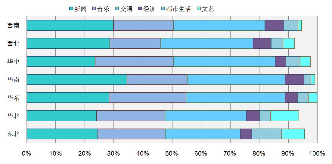 音乐广播在华东、华中两个片区的收听表现不错,市场份额均在25%以上,上海、南京、武汉等城市都是音乐广播较为活跃的城市,其中上海流行音乐动感101不但在收听率表现突出,广告创收也节节攀升,在上海地区多个音乐频率竞争的情况下,以其定位明确取胜。虽然不同地区音乐广播频率众多,但由于各自定位明确,能够吸引到不同的人群,彼此间形成良性的竞争,从而扩大音乐广播的整体市场份额。