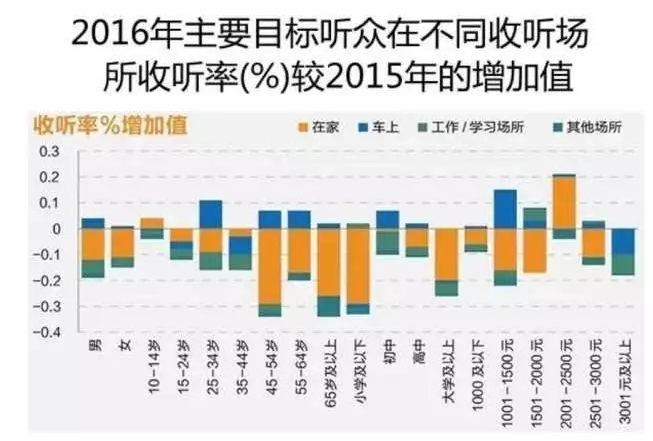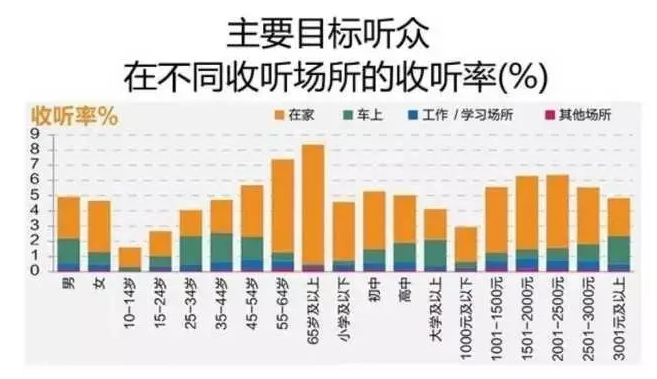 总体收听率数据显示,2016年男性听众收听率高于女性;收听率随年龄的增长而增长;中等学历听众收听率相对较高;月平均收入1500元到2500元听众收听率较高。