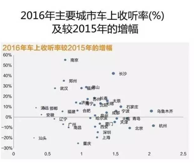 调查数据显示,车上收听率相对较高的市场有杭州、乌鲁木齐、北京、青岛、石家庄、大连、宁波、天津、长沙、太原和成都等,但在其中的北京、杭州、天津、大连和青岛车上收听率较2015年有所降低。而在另外一些城市,如清远、邯郸、武汉、郑州、南京、济南、合肥和南宁,2016年车上收听率较2015年有大幅度的提升。