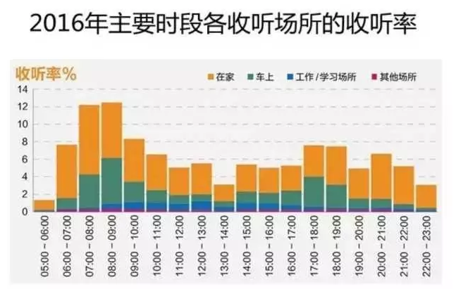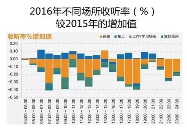 调查数据显示,相比于2015年,广播收听率总体在全天的多数时段出现了降低现象,尤其以07:00-09:00和17:00-19:00时段的在家收听率降低为明显。与在家收听率明显降低形成对比的是,06:00-09:00和16:00-18:00时段车上收听率有明显的增长。