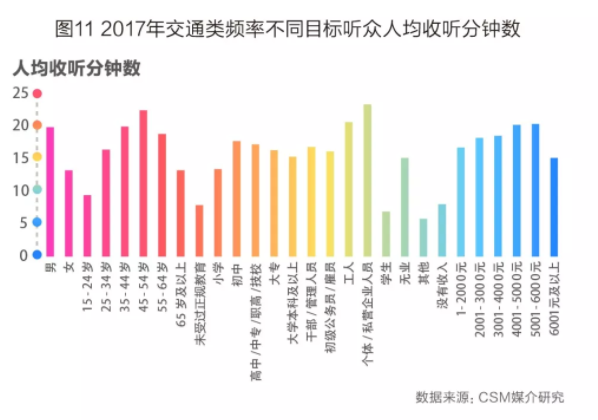 从不同目标人群收听交通类频率的时长来看,男性听众每天收听时长为19.8分钟,女性为13.2分钟;35-54岁中年人群每天收听时长高达42.3分钟;从初中到大学本科及以上各教育程度人群收听时长较为平均;个体/私营企业人员和工人更加偏好交通类频率,每天收听时长累计达43.9分钟。