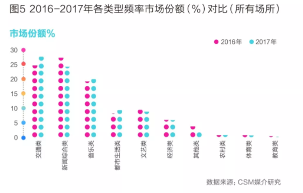 在所有场所各类型频率的收听竞争中,新闻综合类、交通类和音乐类依旧保持着较强的竞争力。其中,2017年交通类频率的市场份额提升较为明显,从2016年的24.66%上升到2017年的27.6%,一举实现反超,成功将保持了多年高位的新闻综合类频率拉下马。同时上升的还有音乐类频率,市场份额为20%。相比之下,新闻综合类频率的市场份额则从2016年的27.3%下滑到2017年的24.15%。文艺类、都市生活类和经济类频率的竞争力相对较弱,市场份额分别为8.76%、9.25%和6%。体育类、农村类和教育类因为受频率定位、节目内容等限制,受众范围较小,市场份额相对较低。