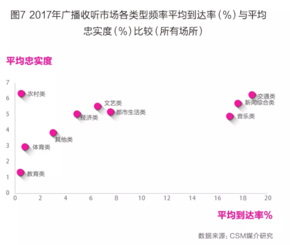 通过平均到达率和平均忠实度这两个维度可以用来考量各类型频率的竞争力,平均到达率反映了听众收听的广度,即有多少不重复的听众收听该频率,平均忠实度反映了听众收听的深度,即听众有多长时间收听该频率而不转台。交通类、新闻综合类和音乐类频率依靠丰富的节目资源优势,吸引着大量的听众,被认为是拉动收听的三驾马车。我们可以看到在所有场所,交通类、新闻综合类和音乐类频率的平均到达率和平均忠实度都处在一个较高的水平上,为强势的媒体平台,而农村类、文艺类、都市生活类和经济类频率的平均忠实度较高而平均到达率相对低一些,属于小众频率。