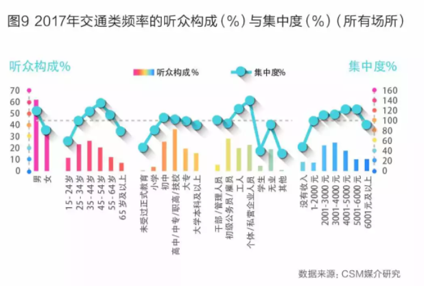 交通类频率想要进一步提升品牌价值,就需要准确定位听众群体,知道哪些人群是交通类频率的特定目标听众。听众构成反映的是交通类频率的主要收听人群,而集中度反映的是哪类人群更爱收听交通类频率。