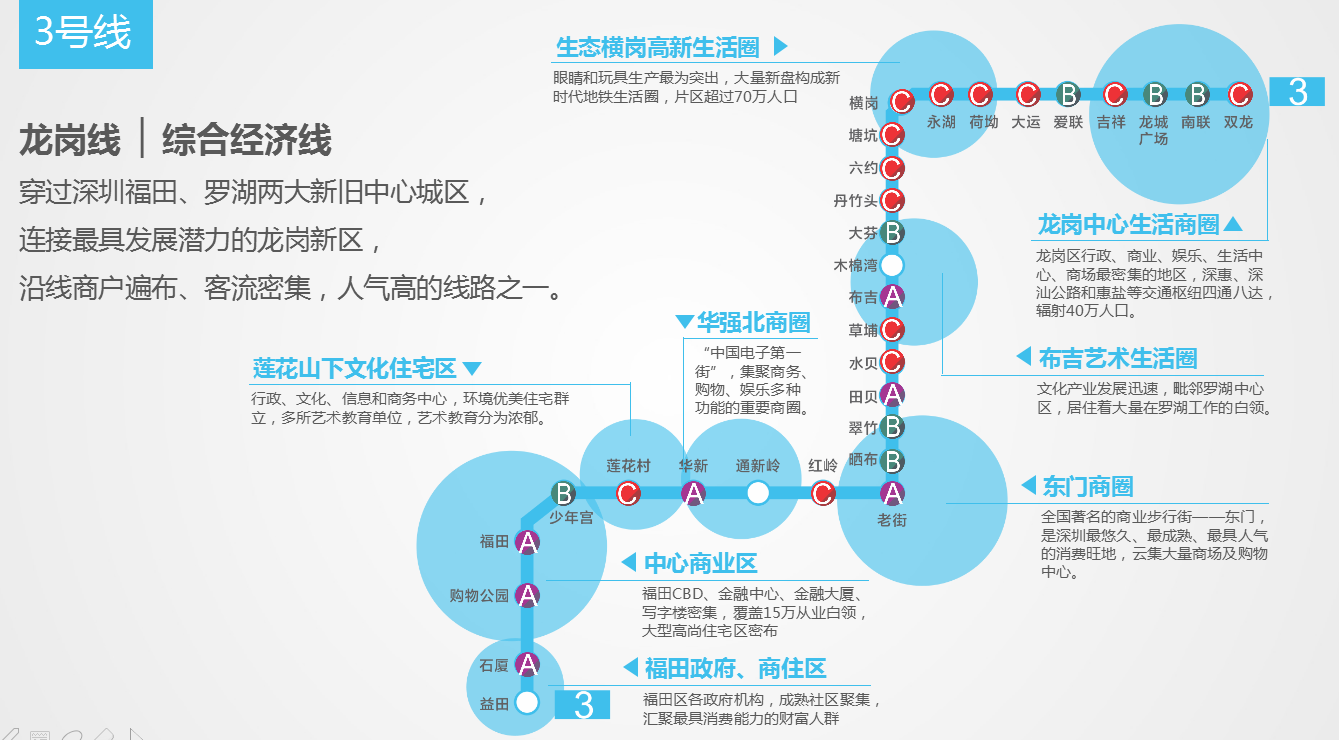 深圳地铁3号线(龙岗线)穿过深圳福田、罗湖两大新旧城区,连接具发展潜力的龙岗新区,沿线商户遍布、客流密集,是和具人气的线路之一。深圳地铁3号线生态横岗高新生活圈,大量新盘构成新时代地铁生活圈,片区超过70万人,越来越多的广告主更加青睐投放深圳地铁广告。