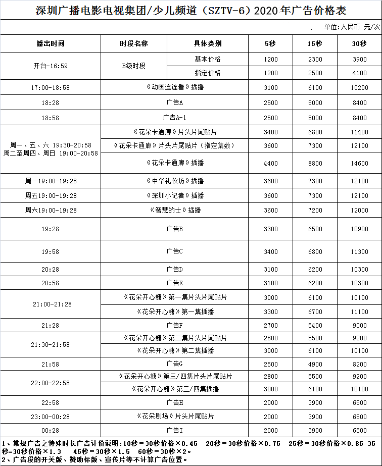 深圳电视少儿频道广告投放套餐:
