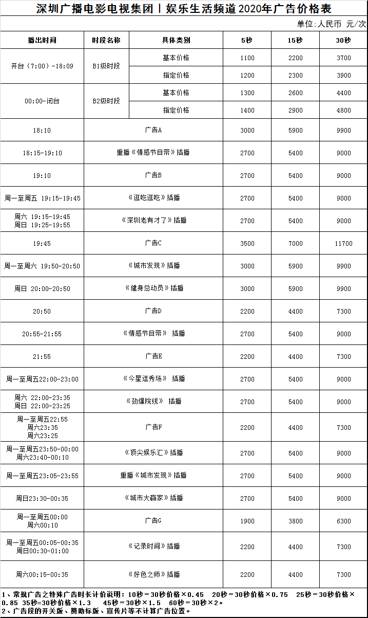 | 形式 | 频道 | 时段 | 时间 | 次数 | 单价 |