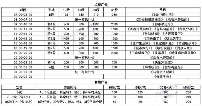 乌鲁木齐新闻广播FM100.7:是一台内容以新闻为主的频率。乌鲁木齐新闻广播凭借好的新闻采编能力,实现了新闻报道高时效的发布,报道角度独到新颖,信息传递准确及时,深受广大听众的喜爱。