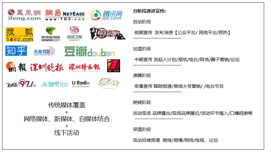 通过深圳广播、电视、网络、微信等各媒体渠道a传播,广播中将植入客户品牌信息,对产品进行同步宣传,活动当天,场地品牌植入,再以接地气的方式现场活动营销融入消费者日常生活,消费者进行随意拍,乐分享将品牌产品传播无限延伸……