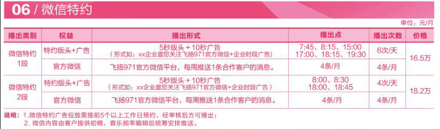 客户的产品通过深圳电台飞扬971高峰期广告播出,同时在飞扬971官方微信平台,每周推送1条合作客户的消息。详情如下: