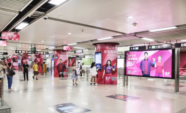 英孚此次深圳地铁广告投放:少年宫站地处福田中心区域,是3&4号线换乘站,日均客流达28万人次。客流覆盖人群以上班白领、高知青年、学生群体为主。周边汇集少儿科技展馆、书城、公园、美术馆等众多优势资源,是市内具文化、创意气息的商圈。通过地段、客流量、乘客特征以及消费能力等综合指标实现英孚媒体投放目标。