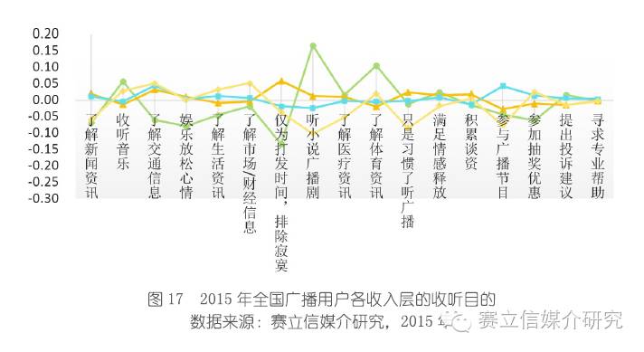 从学历层看,大专及以上的听众喜欢的节目类型主要是消费资讯、娱乐、游戏、财金股市、情感故事、天气预报、文学谈话、法律、潮流,他们喜欢听的节目类型比较宽泛,可以看出高学历听众人群诉求的多元化。