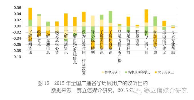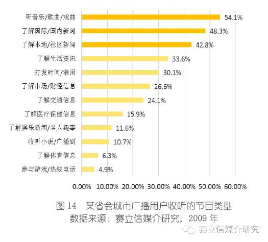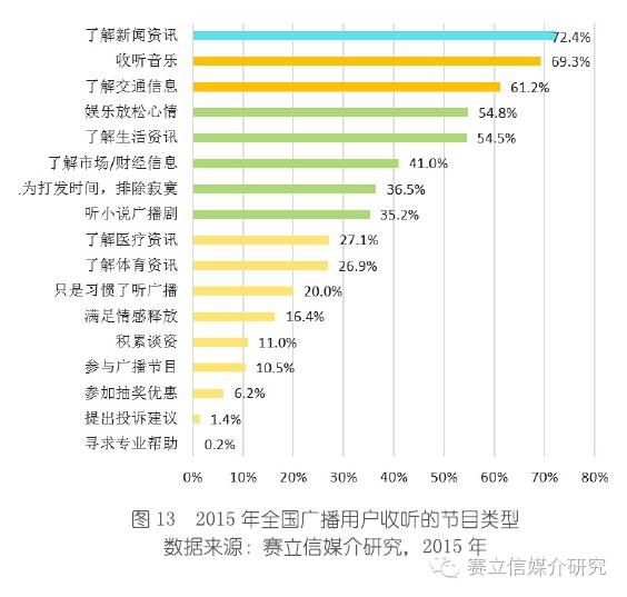 新闻、音乐、交通在近三年的广播收听市场份额里占比zui大。2015年,新闻类频率有所减弱,新闻资讯内容,但不仅仅是新闻资讯,应急广播、新闻深度和广度,娱乐性兼有,比如《大吉利车队》、《海阳现场秀》。音乐类稳健攀升,音乐需求恒久远+音乐台对音乐类型细分有效、做得更好听;交通有所减弱,车联网趋势背景下,交通资讯的需求被百度、高德地图部分替代,zui早强势之下听众的审美疲劳,交通节目里面的内容不仅仅只是交通资讯,还有生活和娱乐方面的内容,而这些都是替代不了的,足以支撑交通广播资讯的保障。